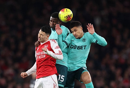 В игре 16-го тура АПЛ "Арсенал" в родных стенах вырвал победу над "Вулверхэмптоном" - 2:1! Терпящие бедствие "волки" добротно провели первый тайм на "Эмирейтс", поставив "автобус" у ворот Джонстоуна. Лондонцы раз за разом стремились вскрыть эшелонированную оборону через зону вернувшегося в старт Сака. Букайо несколько раз оставлял за спиной Тоти, но в целом андердог перекусывал львиную долю подходов "канониров". Лишь незадолго до ухода в раздевалку фаворит чемпионской гонки нащупал что-то впереди. "Арсенал" трижды выводил на ударные позиции Мартинелли, но Габриэл губил моменты в лучших традициях своего тёзки и соотечественника Жезуса... Если до перерыва игроки "Вулвс" изредка появлялись на чужой половине поля, то во вторые 45 минут гости окончательно сконцентрировались на обороне почётных "нулей". "Пушкари" вскрыли "волков" не без доли везения, так как после подачи Сака с углового мяч залетел в сетку от спины Джонстоуна. Эдегор и Троссар не смогли развить успех "канониров", после чего лондонцы вдруг стали оборонять 1:0. Навал "Вулвс" привёл к голу Арокодаре, который прежде не отличался в АПЛ. В компенсированное время "пушкари" во второй раз забили при помощи автогола - Москера неудачно подставил голову после подачи Сака на Жезуса. Спустя неделю "Арсенал" отправится в Ливерпуль на встречу с крепким "Эвертоном", в то время как "Вулверхэмптон" постарается разжиться очками дома против "Брентфорда". ![]() Фото - Getty Images Предыстория. Субботнюю программу 16-го тура АПЛ закроет матч в Лондоне между "Арсеналом" и "Вулверхэмптоном". Единоличный лидер чемпионата Англии и общего этапа Лиги чемпионов принимает абсолютно худшую команду топ-5 лиг. В прошлом сезоне "канониры" продлили победную серию в противостоянии с "волками" до восьми матчей. "Арсенал" является главным претендентом на трофей, который не покорялся гранду из Северного Лондона более 20 лет. Правда, ещё недавно отрыв "пушкарей" от ближайшего преследователя исчислялся шестью очками, а теперь на расстоянии одной победы от команды Микеля Артеты находятся и "Манчестер Сити", и "Астон Вилла". После драматичного поражения от "вилланов" (1:2) в мидвик "Арсенал" разгромил на выезде "Брюгге" (3:0) благодаря дублю Мадуэке и голу Мартинелли. Если лондонцев регулярно сравнивали с "Челси" Моуринью середины 00-х годов, то "Вулверхэмптон" рискует обновить антирекорд "Дерби Каунти" сезона 2007/08, когда "бараны" финишировали последними в АПЛ с показателем всего в 11 очков... Сейчас у "Вулвс" лишь 2 балла после 15 туров - повторение худшего старта в истории английской элиты. В минувший понедельник команда Роба Эдвардса прервала 5-матчевую голевую засуху, что не уберегло "волков" от крупного поражения от "МЮ" (1:4). Калафьори пропустит игру из-за перебора предупреждений, тогда как Габриэл, Москера, Доуман и Хаверц пребывают в лазарете хозяев. После встречи с "Юнайтед" Бельгард присоединился в списке травмированных гостей к Бентли, Мунетси и Гомешу. Ход матча. Артета поменял ровно половину полевых футболистов в стартовом составе "Арсенала" через два дня на третий после игры в Бельгии. В линию обороны лондонцев вернулись оправившиеся от повреждений Салиба и Тимбер, в середину поля были отряжены выздоровевший Райс и Эзе, а в тройке атаке "канониров" с первых минут появился Сака. Вернувшийся в строй Троссар мог усилить нападение "Арсенала" по ход
